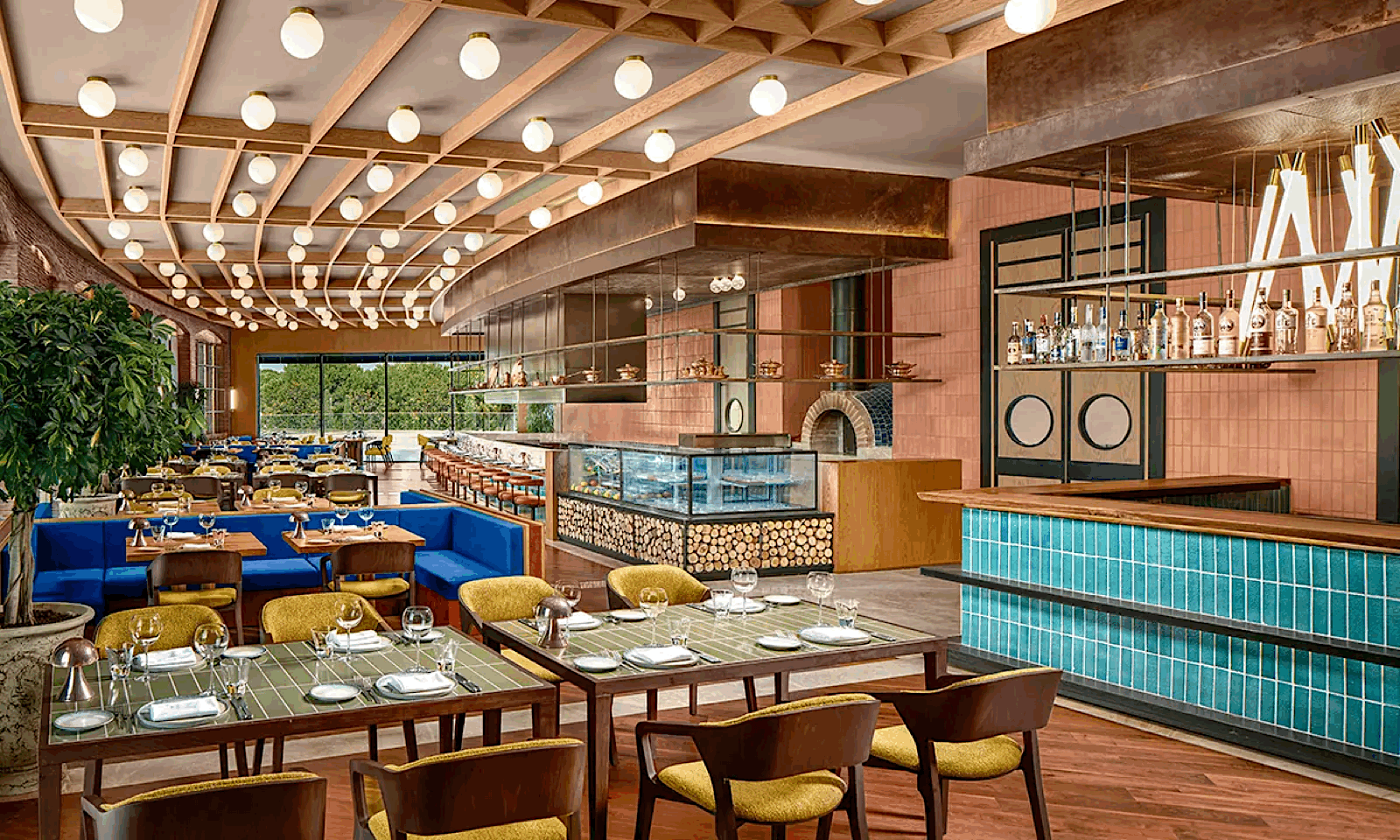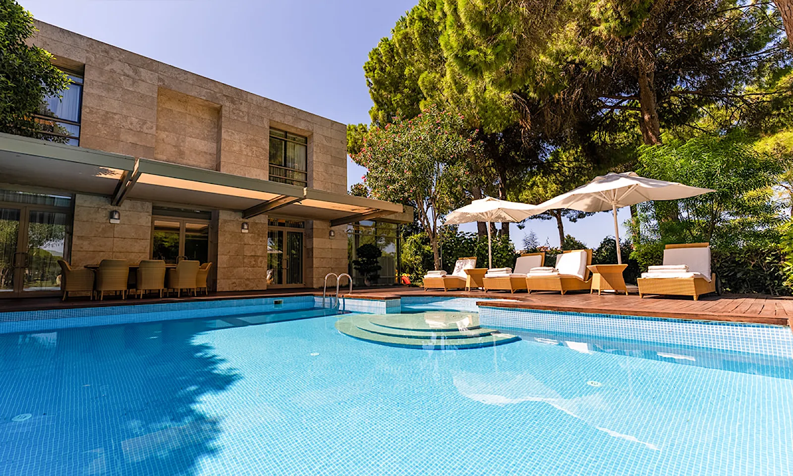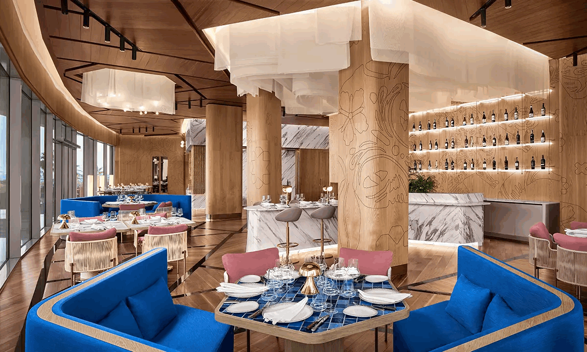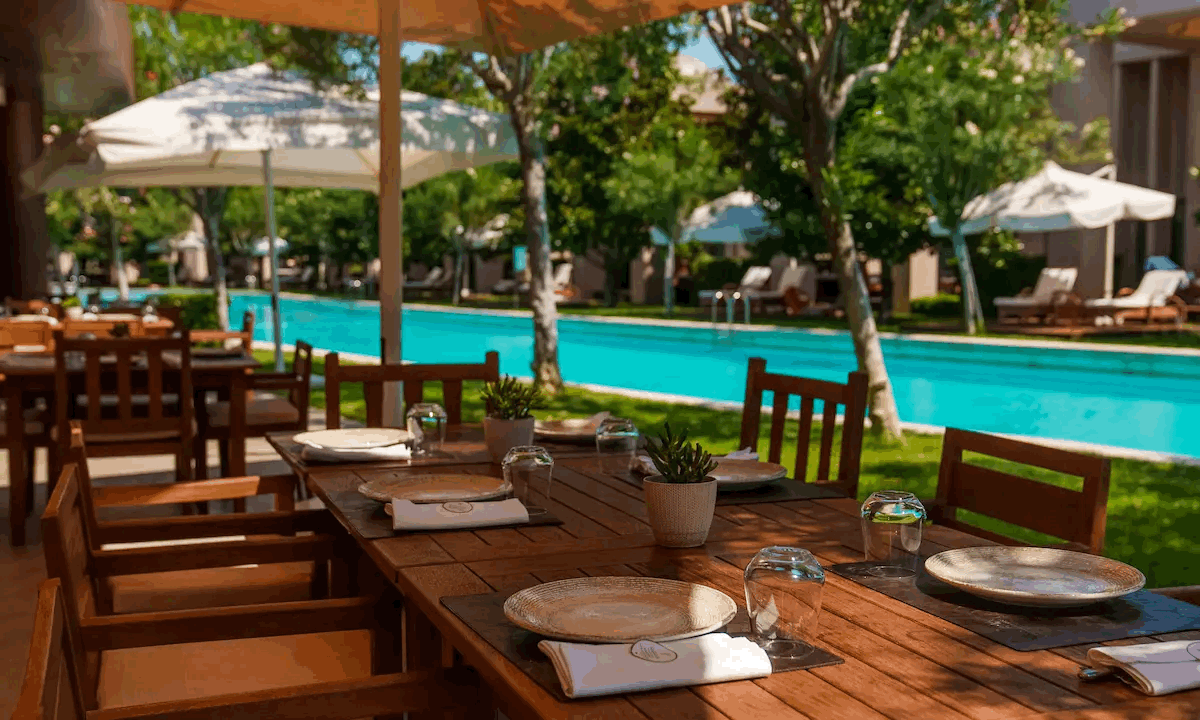 Pier & Pavilions – A long pier juts elegantly into the Mediterranean, while private beach pavilions offer butler service, snacks, and chilled drinks (available by reservation).
