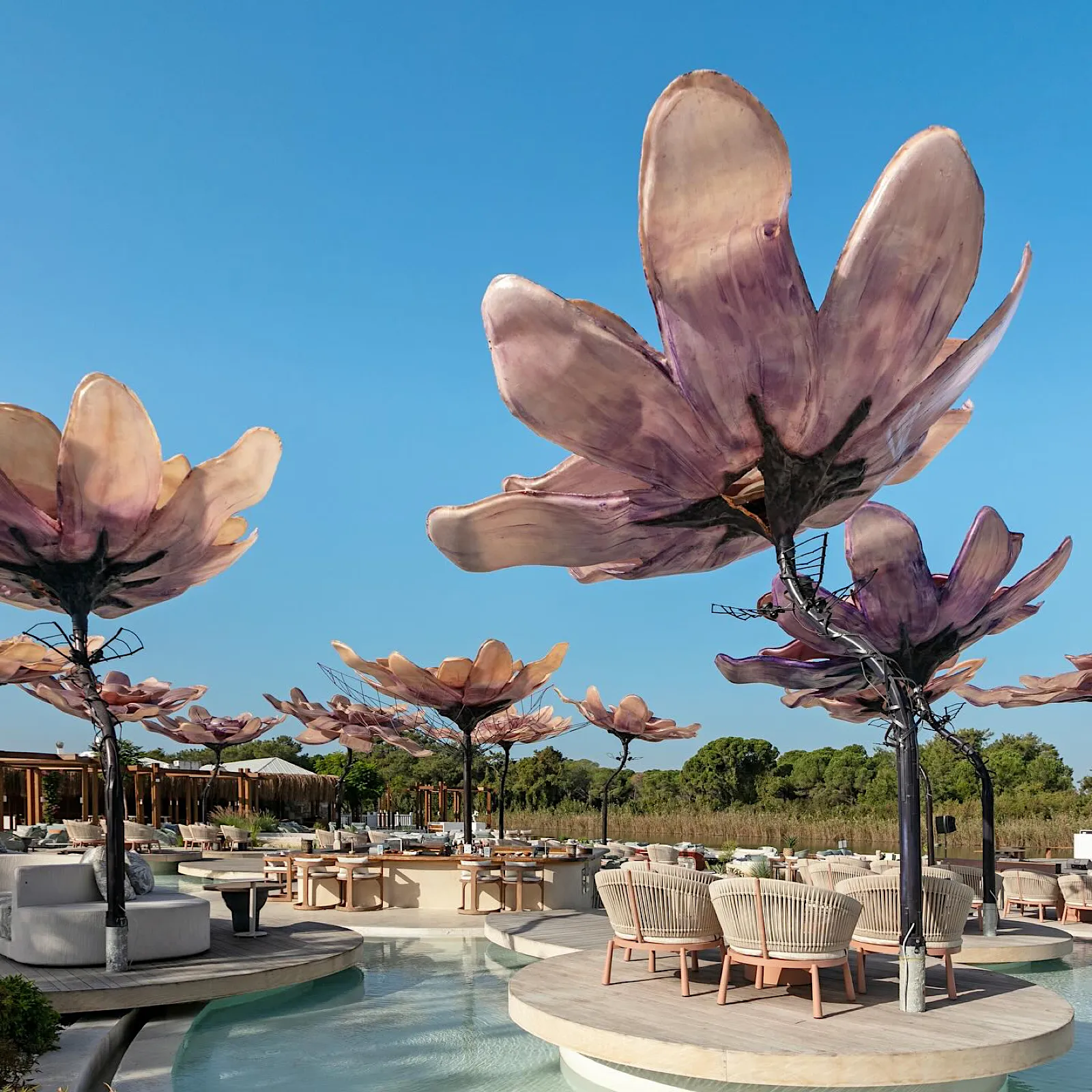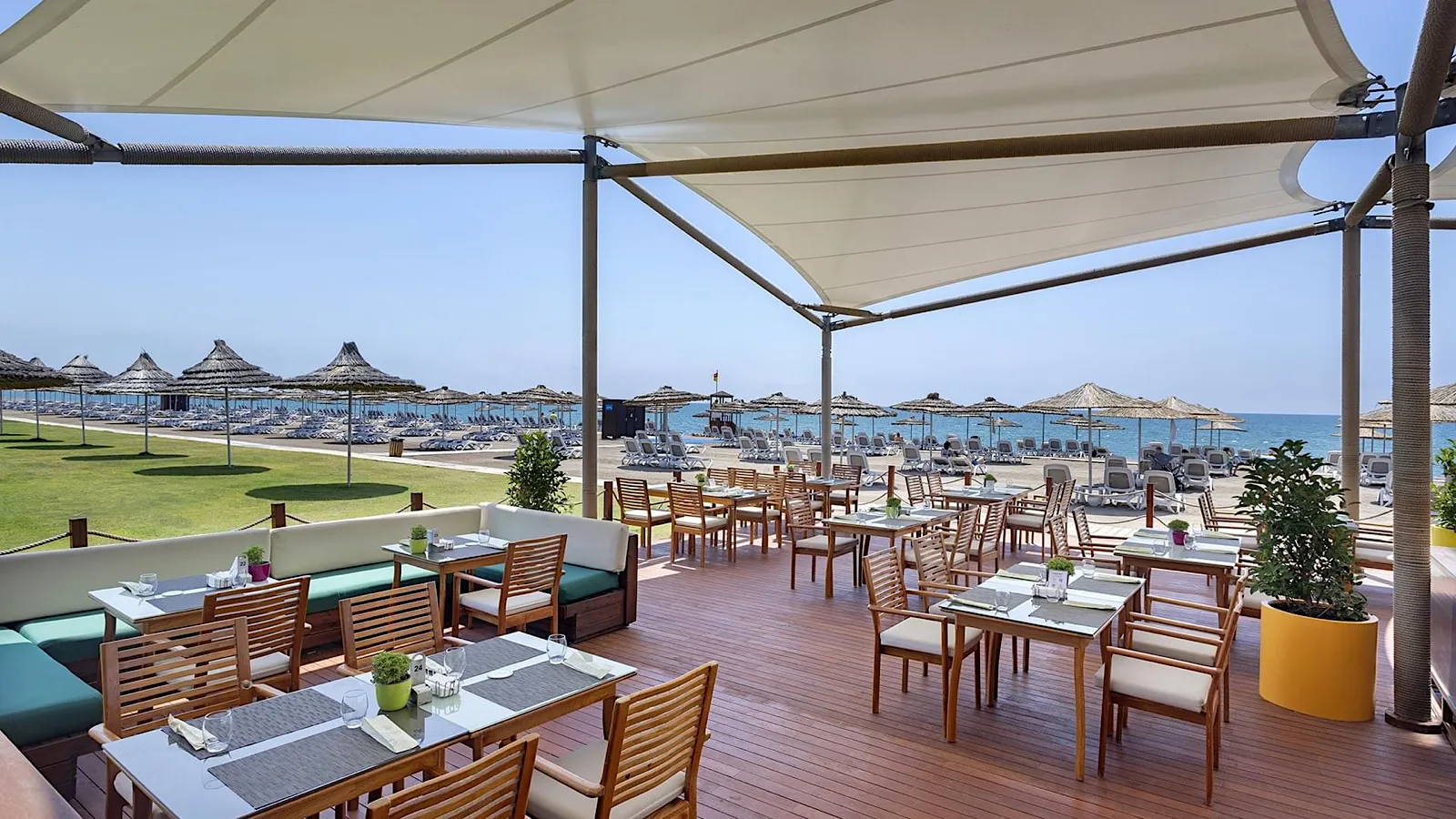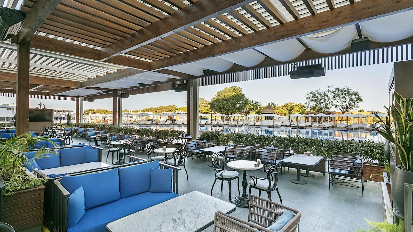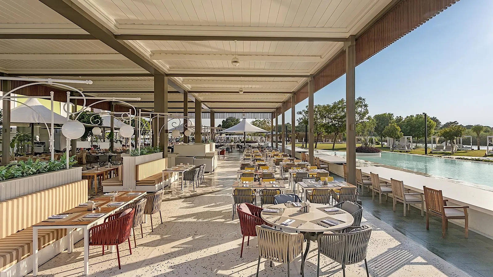 Poolside dining with doner, grilled specialties, ravioli, pita, lahmacun, and vibrant salads (12:30–16:00).
